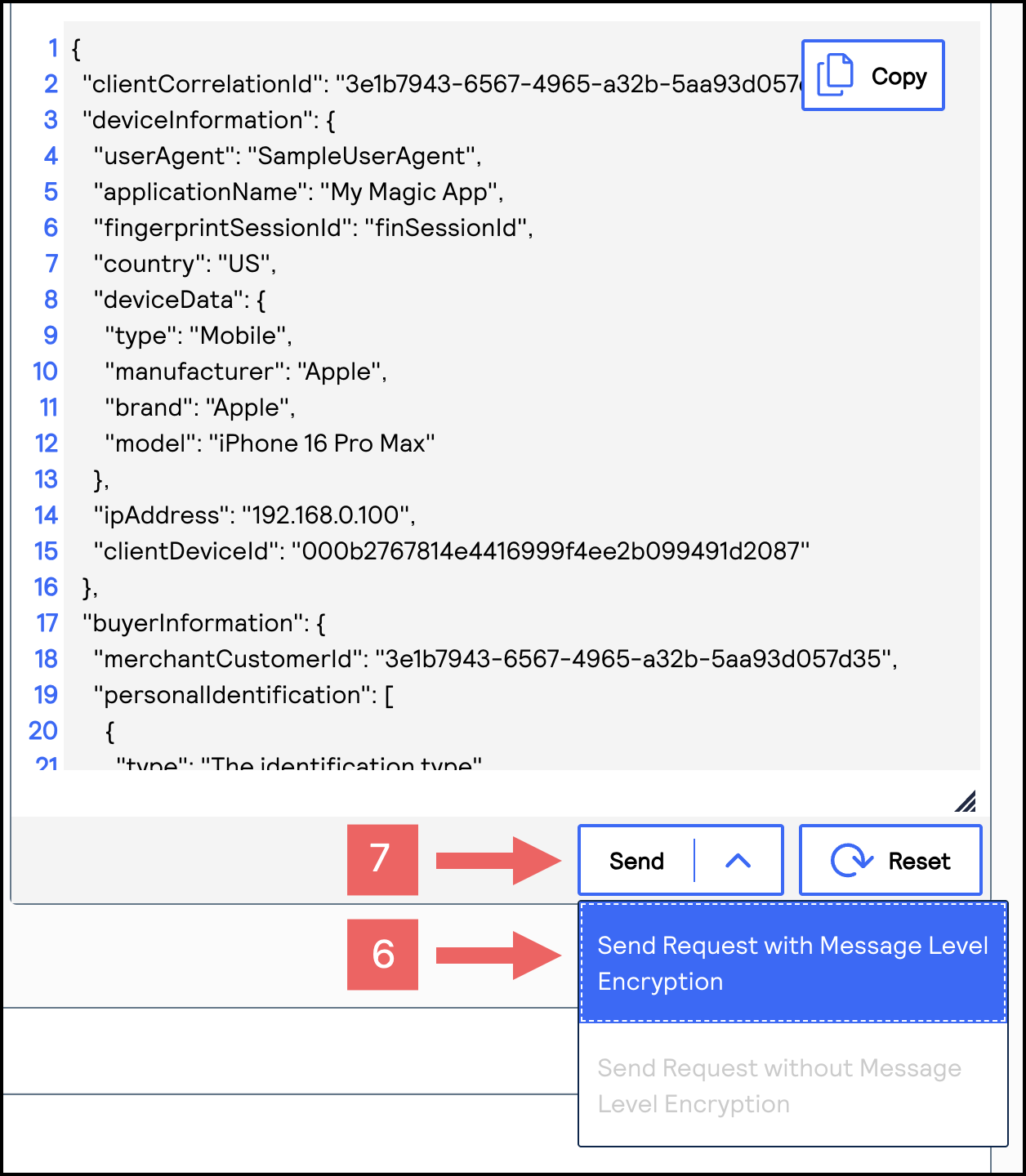 - Choose an API that supports MLE on the left navigation panel.MLE support is indicated byRequest MLEandResponse MLEat the top of the screen.