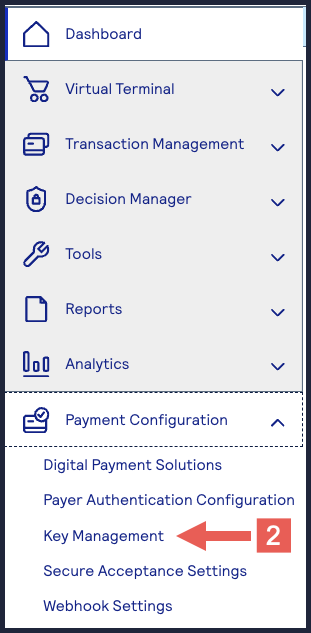 - On the left navigation panel, choosePayment Configuration > Key Management.