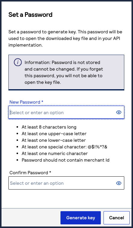 - If you are creating a certificate, the Set a Password window appears. Create a password for the certificate by entering the password into theNew PasswordandConfirm Passwordfields, and then clickGenerate key.The.p12file downloads to your desktop. If prompted by your system, approve the location to which the key downloads.
