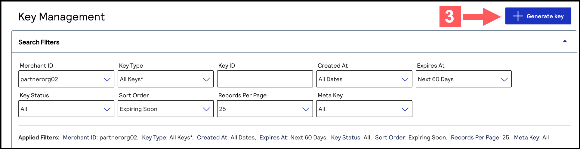 - Click+ Generate keyon the Key Management page.